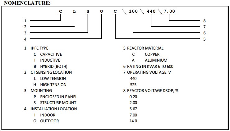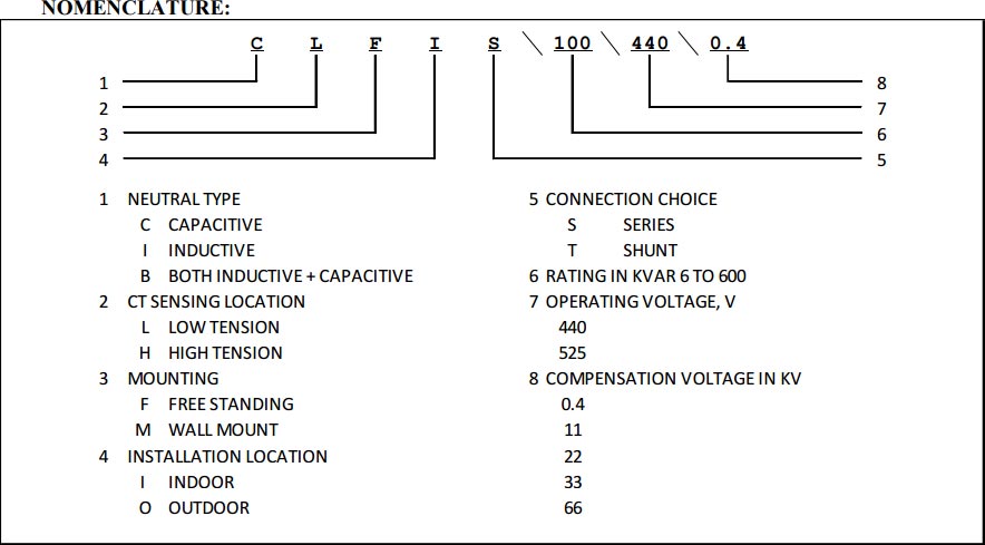 | Series Reactors: Copper and Aluminum wound with 2% for limiting inrush current, 6, and 7 % for harmonics reduction and provide smooth reactive power. Indoor and outdoor structure / panel mount to be selected as per available space and requirements. | |